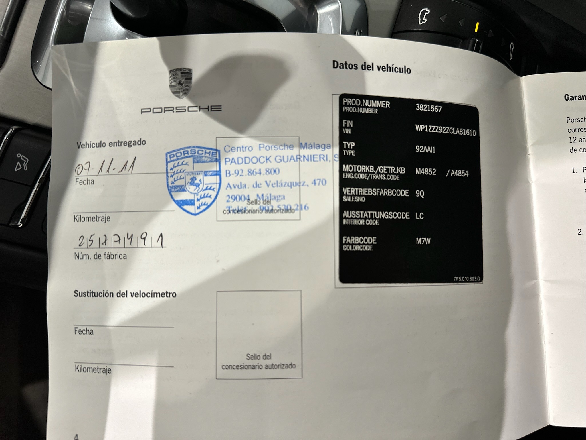 COMPRADO EN CENTRO PORSCHE MÁLAGA EL 7 DE NOVIEMBRE DEL 2011
